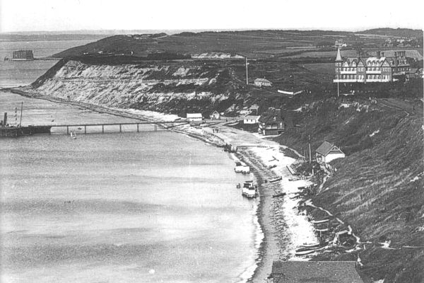 View of Totland Bay c. 1890. Due to the lack of sea defences, the cliff was far more vulnerable to erosion at its foot by the sea, consequently the cliffs collapsed regularly, leaving fresh sections uncovered.