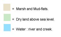 KEY![]() The map shows the narrow neck of land - a favourite site for early plantations as it offers good protection from native attacks, being surrounded by water and marsh on three sides and therefore requiring defence only on the narrow land side. There are a number of places on the creek that offer suitable landing places from a boat, where the river runs very close to the land : these are mainly located on bends in the river. (A good example can be seen at the very bottom of the map.) |