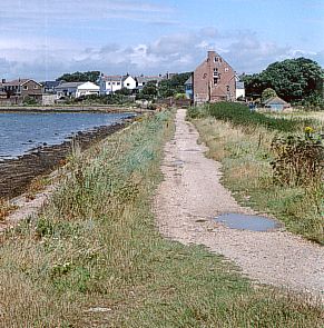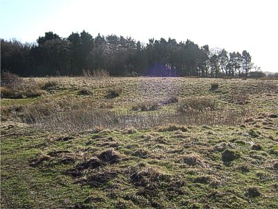 | The "seawall" or mill embankment, looking north from the southern end. Yarmouth mill can be seen at the end. | View of redoubt site from the southern end of the mill embankment, looking southwards and showing large depression in the centre. Refer to 19th century maps of this area. |