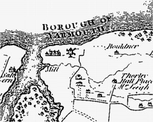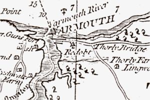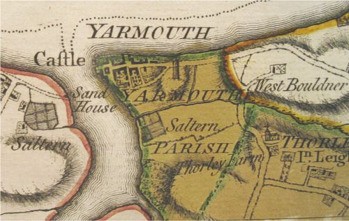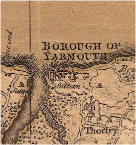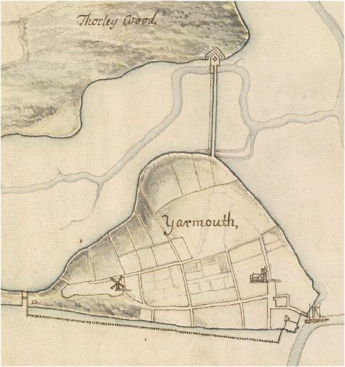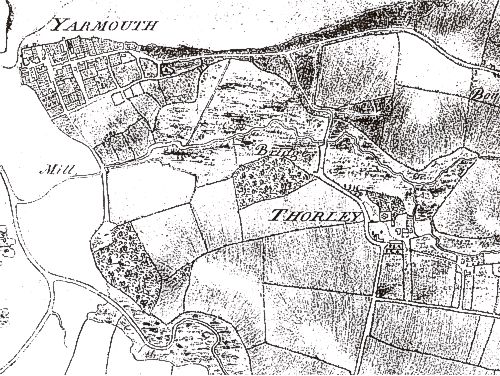 1792 map of the Yarmouth area, overlain with map showing Thorley Haven and original road to landing place at Yarmouth.