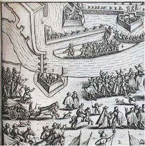 Almost a hundred years later, additional defence was required to secure the town. In 1629, fearing invasion from the French, a small group of Island gentry, including Sir John Oglander, "concluded to goe to London, to petition his Matie for moneyes to have owre castells and fortes some amended, others where most nede requyred, newe erected; and also for to have 2 places of retryte, if so wee showld be beaten; Videlicet - Freschwater for owre cattel, and ye mayne bodie of owre companies; and Yarmouth for ye bettor sorte of people, where they myght by bote have intercorse one with ye other; the fortifiinge of which places of retrayt myght be doone by cuttinge of Freschwater Gate; and Yarmouth by ye cuttinge of ye nicke of land betweene ye 2 seaes, with drawe brydges and half moones to secure ye passages." Oglander had estimated it would cost "for ye fortifiinge of Yarmouth to make it a place of retrayte with cuttinge ye seae, makinge a drawebridge and halfe moone, 250£ ; the lyke for Freschwater, 250 £ ..." Later in 1638, the Mayor and Burgesses issued a petition against this plan, claiming that it would ruin their harbour by reducing the current of the river, the force of which was only just sufficient to keep the harbour clear [SP 16/408 f. 69, 70].