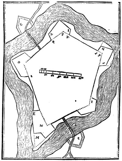 6. The new method of fortification. Sébastien Vauban. 1691. Demi-lune, is a small flank'd Bastion, plac'd before the Point of a Bastion, when it is too weak; sometimes this Work is plac'd before the Curtin, when the Moat is a little wider than it ought to be |