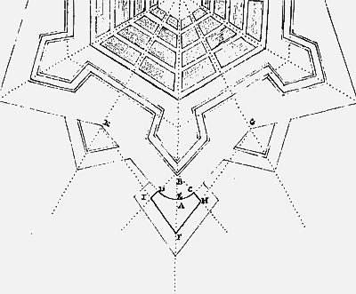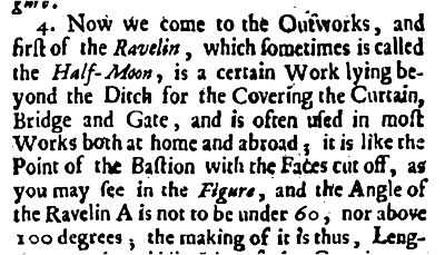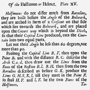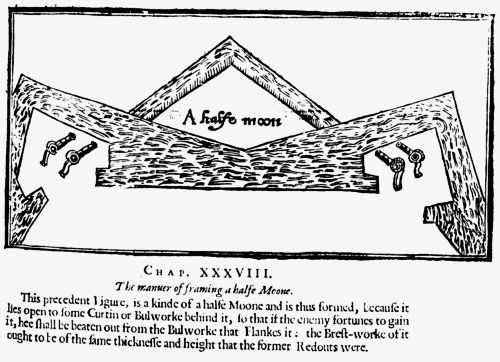 | 3. The First Lecture being an Introduction to the Military Architecture, or Fortifications. Sir Balthazar Gerbier. 1650. That Half-Moons are small Works advanced towards the Fields, and are usually placed before the points of the Bastions for their re-inforcement, having small Flanks.