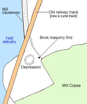 Today the site has been cut through by the old Freshwater to Newport railway track embankment that crossed the Thorley marshes obliquely from Yarmouth railway station to the southern end of the mill embankment. On the south side of the junction of the mill dam and the railway embankment, there is a large depression feature, which is filled mainly with rushes and is wet and boggy in winter. This seems to correspond with the ditch of the lunette. This depression is shown on 19th century maps as a pond. At the side of the footpath through to Mill Copse, some mortared brickwork and stone was unearthed, revealing early 18th century bricks. There was also a considerable spread of mortar in the soil at this point too. A sample brick measured almost 8" in length, 4" in width and 1 7/8" - 2" in breadth. This is consistent with 17th and 18th century brick dimensions. It is a place brick, showing the rough indentations of a brick made and dried straight on the ground. It is a terracotta colour, veering on a light orange in places. Small stone inclusions occur. The bricks are very similar to those of Shandon in the High Street, Yarmouth, an early 18th century brick-built house. |  |