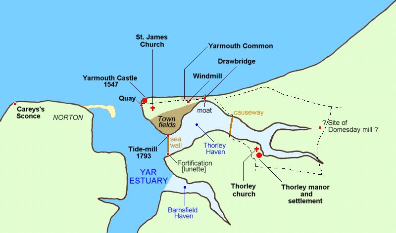 A 1792 map and subsequent maps all show the Thorley Brook as entering the marshes on the north side of the Thorley Haven. Possibly the fort was dismantled when the tide mill was built and the entry of the brook into the River Yar was diverted from the south side to the north.