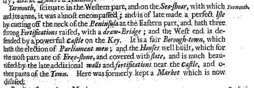 The sea formerly nearly surrounded Yarmouth until the year of 1664, when Sir Robert Holmes being Governor of the Isle of Wight, formed and embanked the marches. It was then garrisoned by a company under his own immediate command; and considered at the time to be strongly fortified. A redoubt for small arms was thrown up near Thorley wood adjoining to the present mill; canon were placed at a landing near the castle. Three pieces of canon were placed on the common facing sea, now called the Bulwarks; breastworks were thrown up at the shore; and large stakes, drove in to prevent the landing of boats, nearly surrounded the place; the stakes are still easily discovered at low spring tides. At this time, the very narrow neck of land at the eastern entrance was secured by a drawbridge. [The Hampshire Repository, vol. II. 1801}